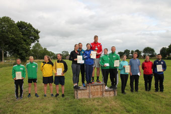 Ein voller Erfolg war der 1. Rahester Boßelcup, den „Ostfrisia“ Rahe anlässlich des 100-jährigen Vereinsjubiläums am vergangenen Wochenende durchgeführt hat. Den Anfang machten am Samstag insgesamt 49 Mixed-Teams, die um die Preisgelder werfen wollten. Alle Mannschaften mussten in der Vorrunde eine festgelegte Strecke absolvieren. Für die besten 32 Mannschaften ging es dann nach der Auslosung in die KO-Runden. Mit 10 Würfen und 165 Metern setzten sich Ramona Gerdes (vereinslos) und Johann Weber (BV Ludwigsdorf) in der Vorrunde durch. Den 32. Platz erkämpften sich Sara und Fynn Meyerhoff aus Südarle. In spannenden Duellen ging es dann Runde um Runde in umgekehrter Streckenführung um die begehrten Podestplätze. Am späten Nachmittag konnten sich die Halsbekerin Feenja Bohlken und Bernd-Georg Bohlken aus Grabstede im Finale gegen Femke Wilberts und Tobias Djuren von „Noord Norden“ durchsetzen. Beide Bohlkens hatten tags zuvor bereits den Wieseder Mixed-Cup für sich entschieden. Im kleinen Finale setzten sich Anke Klöpper und Ingo Schoolmann aus Südarle gegen das Vater-Tochter-Gespann Milena und Peter Bohlen aus Tannenhausen durch. Noch spannender ging es am Sonntag in der Männerkonkurrenz zu. Hier waren 56 Mannschaften am Start. Das beste Vorrundenergebnis erzielten der Drittplatzierte vom Vortag Ingo Schoolmann zusammen mit Keno Schoolmann (Upgant-Schott) mit 9 Würfen und 171 Metern. Um den letzten Platz in der KO-Runde mussten drei Mannschaften ein Stechen auswerfen, da alle Teams gleichauf mit 11 Würfen und 119 Metern ins Ziel gekommen waren. In einem spannenden Wettkampf holten sich die Routiniers von „Hoffnung“ Ludwigsdorf Karl-Heinz Fleßner und Ewald Block das Ticket für die nächste Runde. Die vielen Zuschauer freuten sich über hochklassige Duelle, die zum Teil erst auf den allerletzten Metern entschieden wurden. Ins Halbfinale schafften es dann vier Mannschaften, die mit bekannten und erfolgreichen Boßlern besetzt waren. Im Werfen um den dritten Platz hatten Andre Koch (BV Sch.-Leegmoor) und Daniel Jurisch (BV Pfalzdorf) das Nachsehen gegen die Westeraccumer Jürgen Sassen und Robert Djuren. Das Finale bot dann noch einmal Spannung bis zum letzten Wurf. Beide Teams ließen sich nicht aus den Augen und lagen kurz vor dem Ziel gleichauf. Tobias Djuren hatte bereits am Vortag seine Klasse unter Beweis gestellt und traf auch seinen letzten Wurf zur Freude von seinem Partner Malte Gronewold aus Theener. Die Willmsfelder Christian Hinrichs und Christian Gerdes ließen sich nicht aus der Ruhe bringen und Gerdes fand wie Djuren die Ideallinie und sicherte den Sieg mit ganzen 2 Metern Vorsprung. Nach den Siegerehrungen wurde an beiden Tagen noch bis in die Nacht zusammen gefeiert. Die Organisatoren freuten sich über das Lob von allen Seiten und die Frage nach einer Wiederholung des Rahester Cups im nächsten Jahr. Mit großem Einsatz und der Unterstützung von über 100 Vereinsmitgliedern von der Jugend bis zu den Ältesten war mit Brötchen, Kaffee und Kuchen im Zelt, Gegrilltem und Getränken am Bierwagen auch für das leibliche Wohl der Boßlerinnen und Boßlern gesorgt. „Ostfrisia“ Rahe bedankt sich bei allen Teilnehmer-/innen und Unterstützern für ein unvergessliches Wochenende.